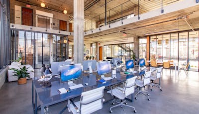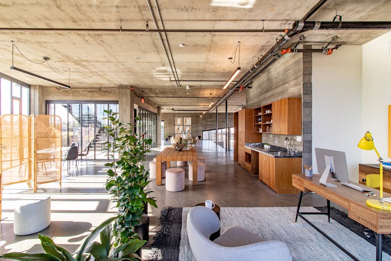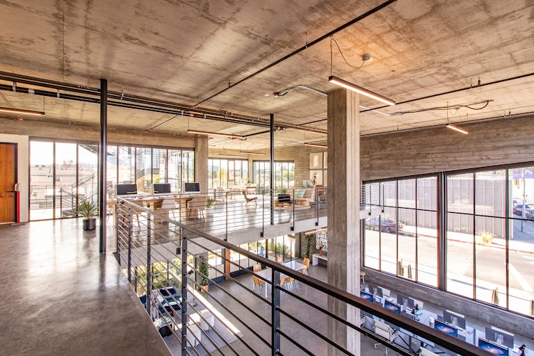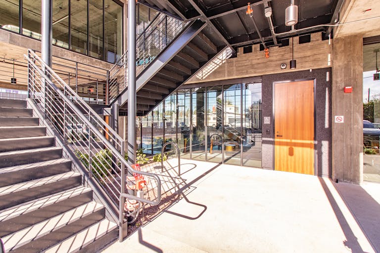 Much like an artist’s studio, the bright and open offices showcase floor-to-ceiling windows, polished concrete floors and exposed concrete walls. Each floor includes a separate entry with attached patio space. To the exterior, a board form concrete method is applied on the first three levels. Known as a more craftsman approach to construction, this feature adds unique character and texture to the design. Topping it off at the 4th floor, a modern steel and wood frame is showcased on the underside of the roof level.