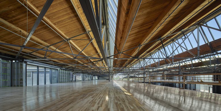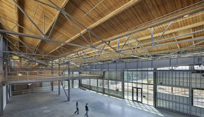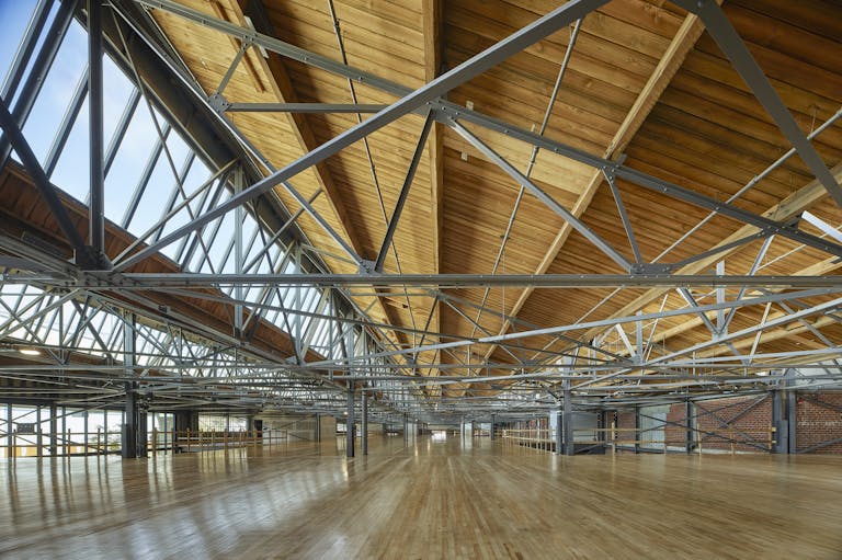 Original building features such as skylights, gantry cranes and freight elevators were kept intact and incorporated into each structure's updated architectural design. Original historical window frames were kept intact after abatement for lead paint and reglazed. The original sawtooth roof design was retained, as well as the exposed wood on the underside of the roof deck. The original mezzanine was also kept in place and original mezzanine flooring was refinished.