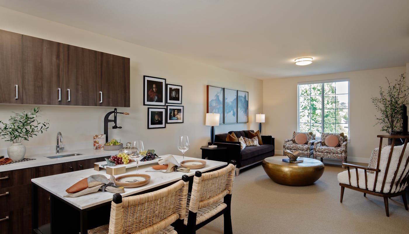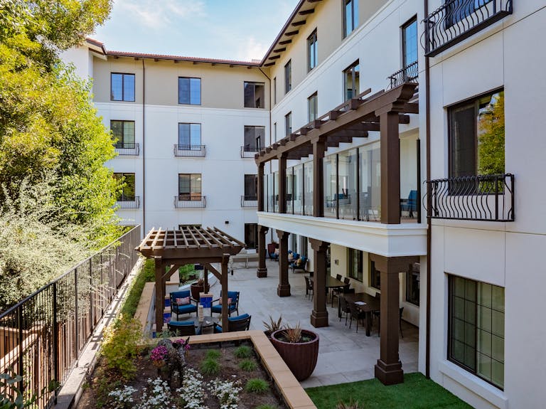 Designed in mission style architecture as a nod to the nearby Mission San Rafael, the new Aegis community complements the surrounding neighborhood, while the exterior design and landscaping allow ease of access to the walkable area.