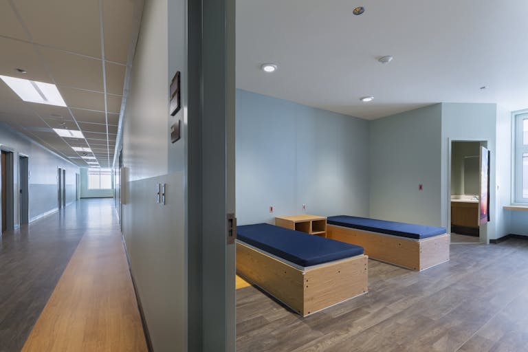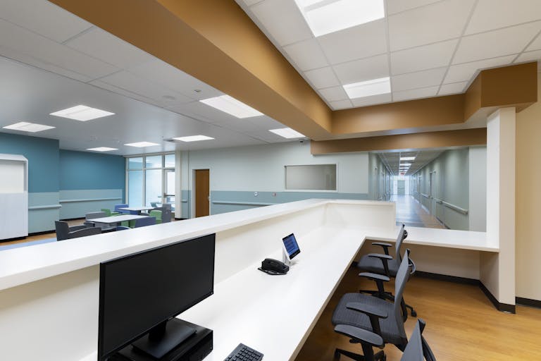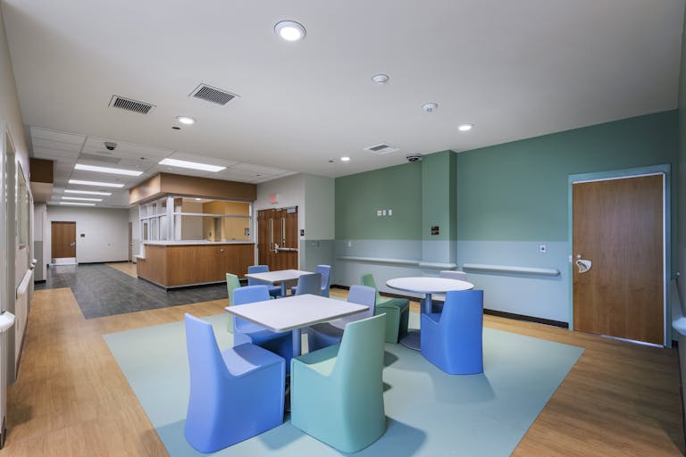 The two-story center holds different wings providing specific care for adult, adolescent and geriatric patients. The building holds patient rooms in each wing, along with several nurse stations, reception areas and cafeteria with full kitchen.