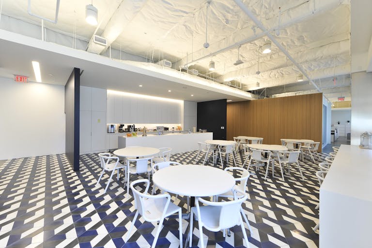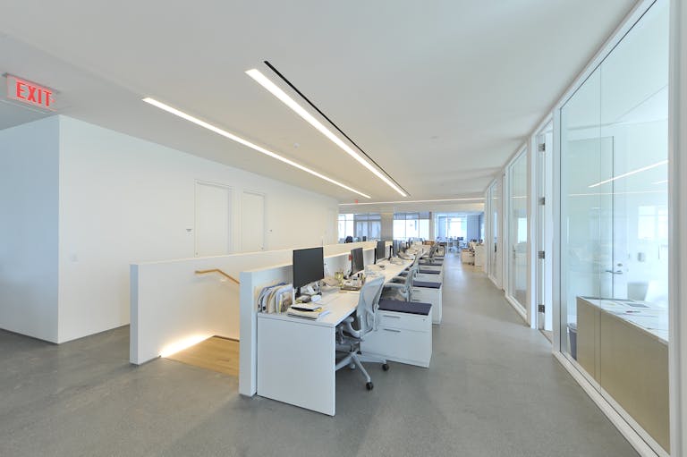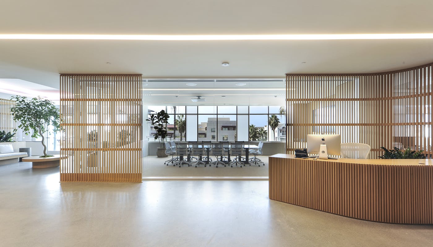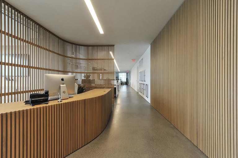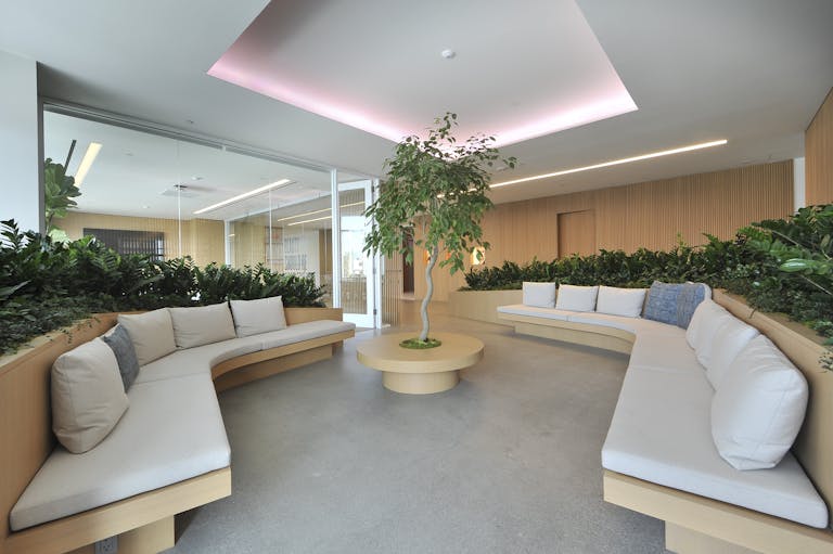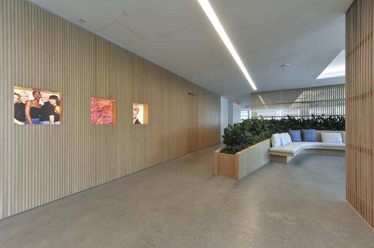 Tenant improvements for the 41,678 sf building feature high-end wood finishes, color accents, and a video wall that complements the reception, lobby, genius bar, kitchen, and lounge area.