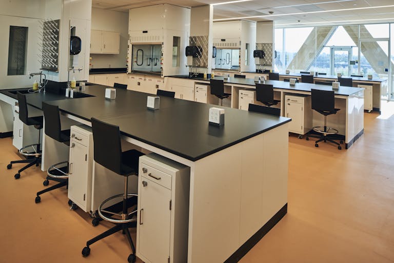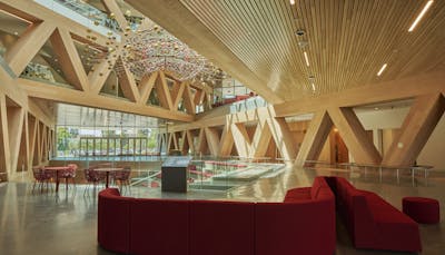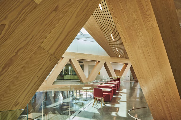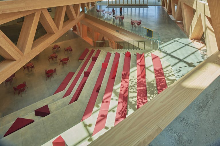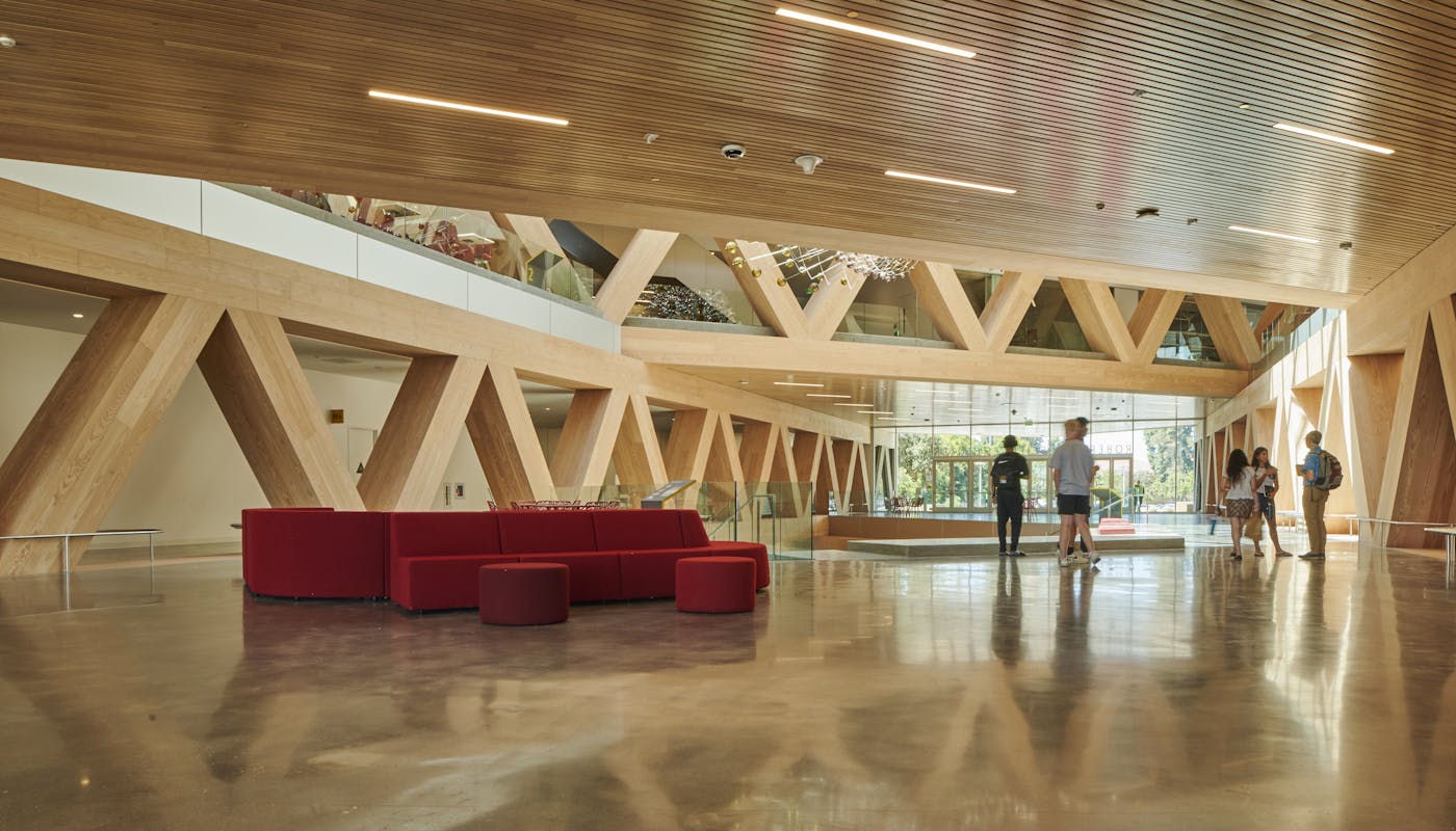 The grand stairs leading up the atrium are designed for students to gather, read and study in groups. The building features a café, library resource room, and glass-walled classrooms offering a 360 degree view of the campus. The interior showcases a signature wood-clad beam design throughout, and interchanging wood and concrete floors. Outdoor terraces on each floor offer more instructional and gathering space. The roof is outfitted with solar panels while the entire project seeks to achieve LEED Gold status.