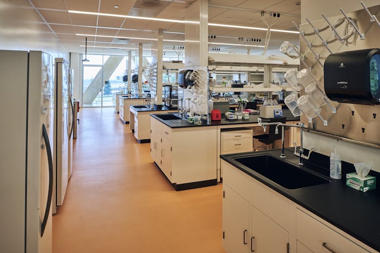 Located at the foothills of the San Gabriel mountains, the building’s stacked configuration of column-less floors contain classrooms and lab space with a central interior atrium. A glass ceiling over the atrium allows natural light to illuminate the interior.