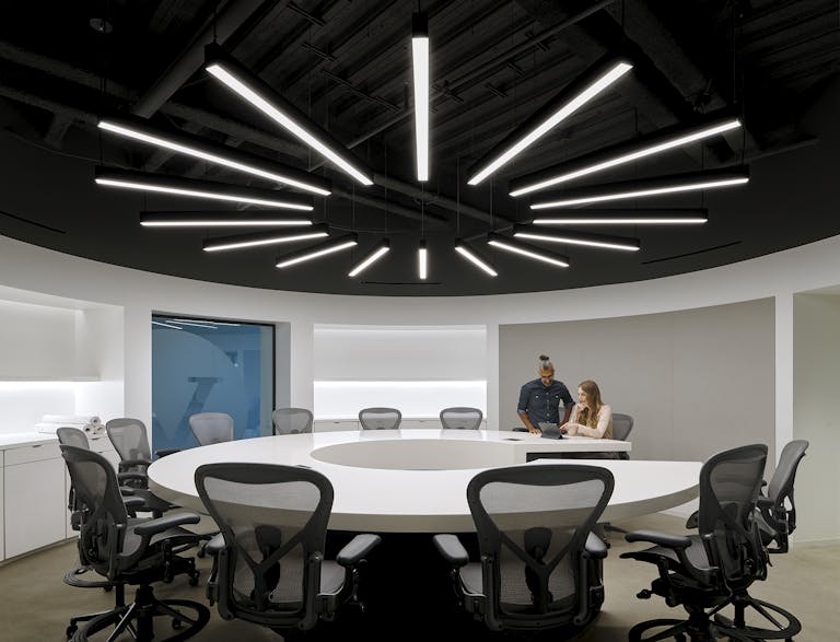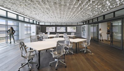 Each area is punctuated by custom mill work, polished concrete, wood floors, and artful pendant lighting installations. Drywall slanted ceilings, fabric wrapped acoustical panels and Arktura specialty ceilings make for a varied and attractive design. Calcutta marble was used on most open surfaces. Glass-walled and private offices feature custom furniture and seating. A cubicle system you will not see.