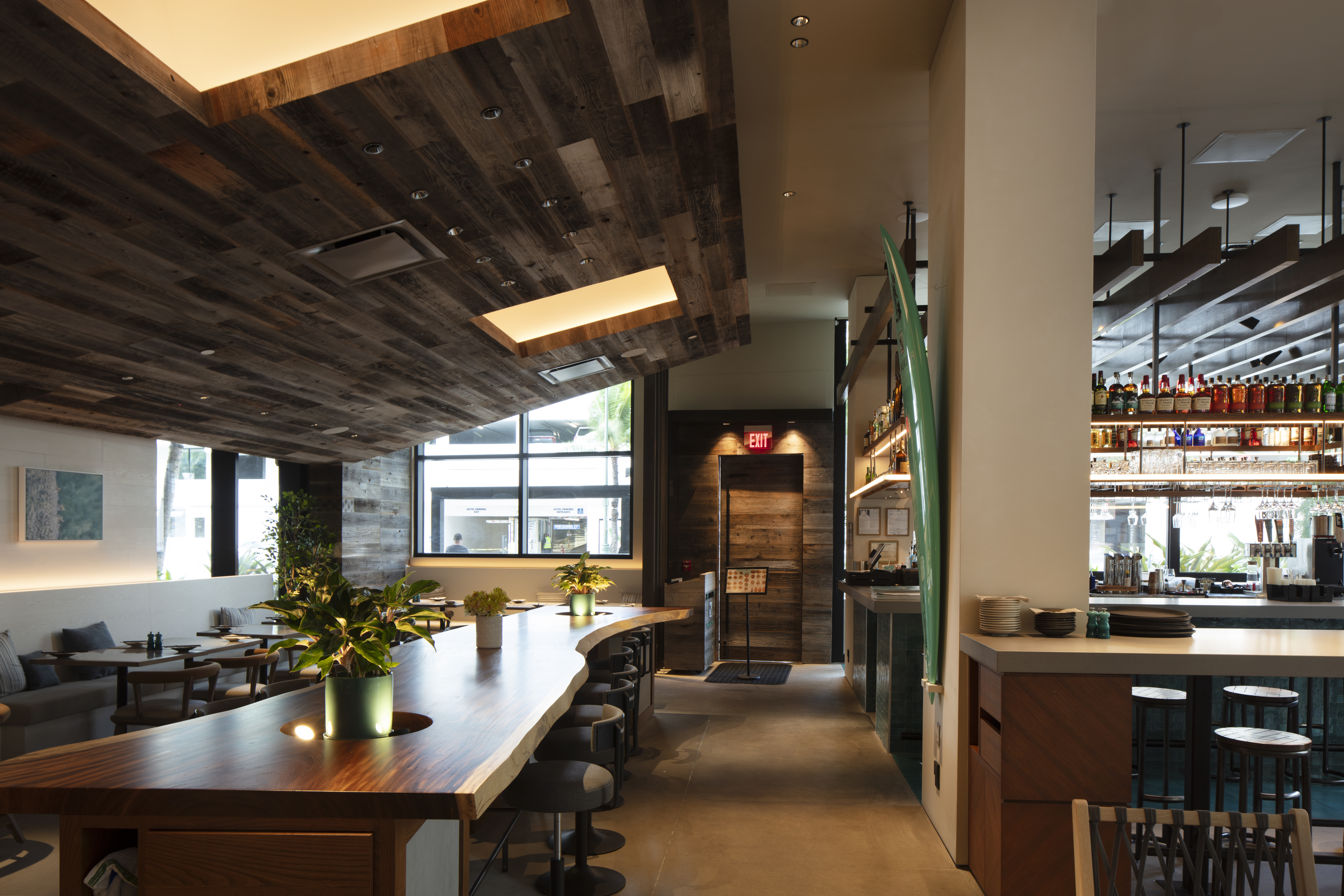 The ramen and seafood restaurant includes a full bar, full kitchen, 18’ fully operable doors, and private dining experience. A variety of both rustic and polished wood finishes bring warmth and variation of textures adding to the fine dining ambiance.