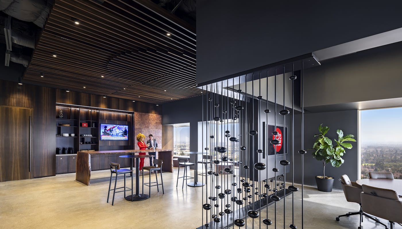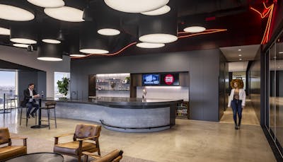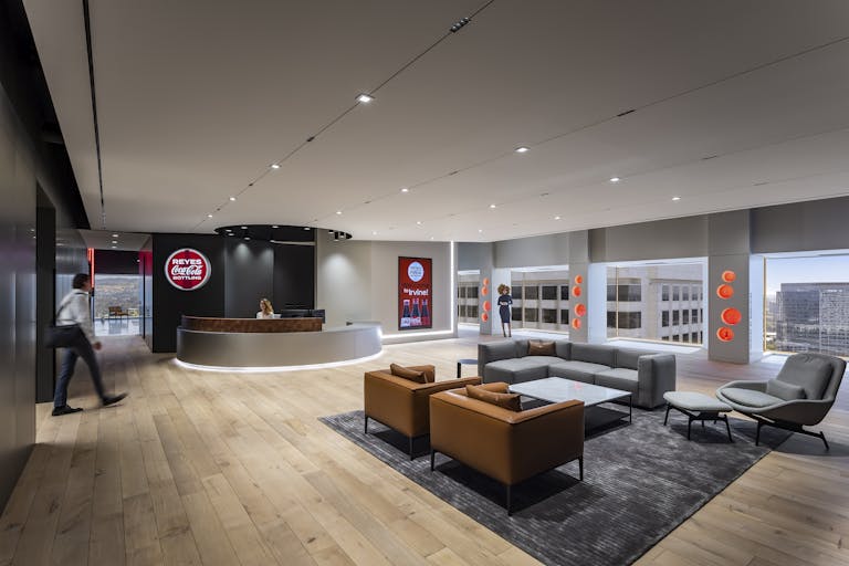 The 21,000 square foot offices were specifically tailored to the needs of the client and immersed with design elements that give a nod toward a classic bottle of Coca-Cola. Upon entering the 20th floor, visitors are welcomed with to the reception area with striking views of the Orange County region.