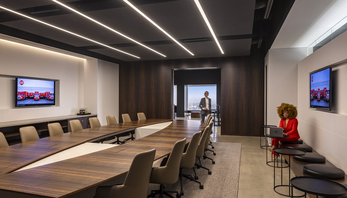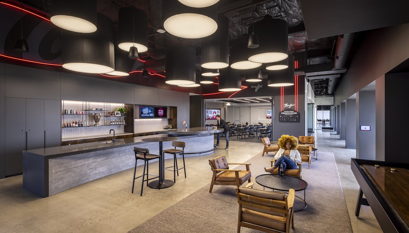 The sleek interior showcases rich colors and textures with custom wood paneling, concrete floors, and artful installations which work to separate meeting spaces in the open office concept. The space is segmented with numerous offices, work stations, conference rooms and board room. The employee cafe and pub for casual staff meet ups opens to an adjacent training room, while sliding panel doors reveal a discreet bar tap and media display for hosting guests or events.