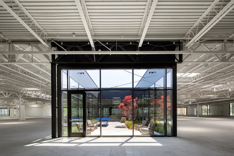 The 260,000 sf single-story building now features high ceilings with flexible floor plates for tenants. Steel frames and concrete are stylistically exposed to show the character of the original structure.
