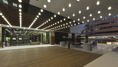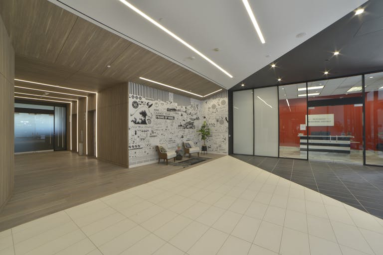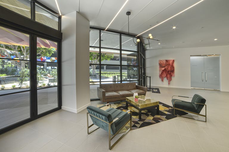Upon entry to the site, guests are greeted with an arrival area showcasing colorful outdoor art and café lights next to a welcoming lounge space. The lobbies of each office building have been redesigned with an open indoor-outdoor concept, contributing to the creative atmosphere.