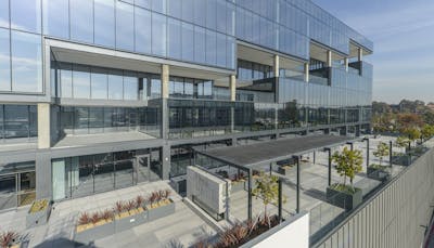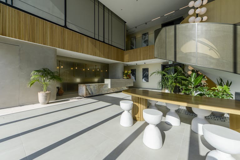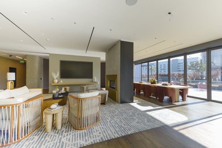 What sets the 300,000 sf mixed-use structure apart from traditional office spaces are its open flexible floor plans with the minimal use of columns, high ceilings with floor-length windows, and the option of indoor-outdoor workspaces as each floor opens to a balcony. A 15,000 square foot outdoor sky deck also offers premium event space with panoramic views of the city. Entrada is built and designed for industry-leading tech and media tenants in the Los Angeles market.