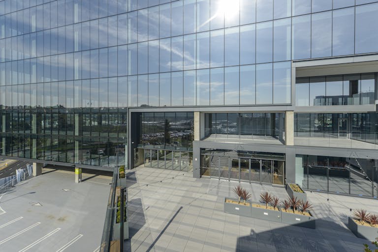 Standing at almost 150 feet, six elevated office floors are seen atop five levels of parking, with an additional level underground. The ground-level provides an expansive view of the palatial first floor, offering space for forthcoming shops and restaurants.