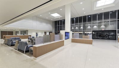 Construction was planned in separate phases as the project occurred while the lobby was fully operational and occupied. High end finishes like terrazzo floors, glass doors, skylights, three-form paneling, and custom cabinetry provide a sleek look.