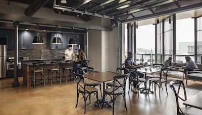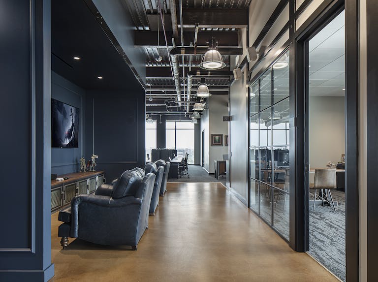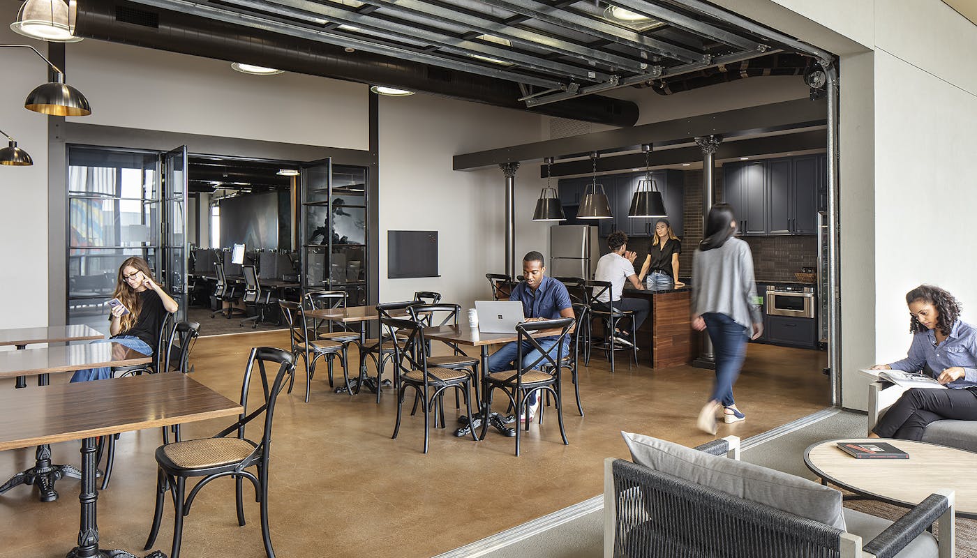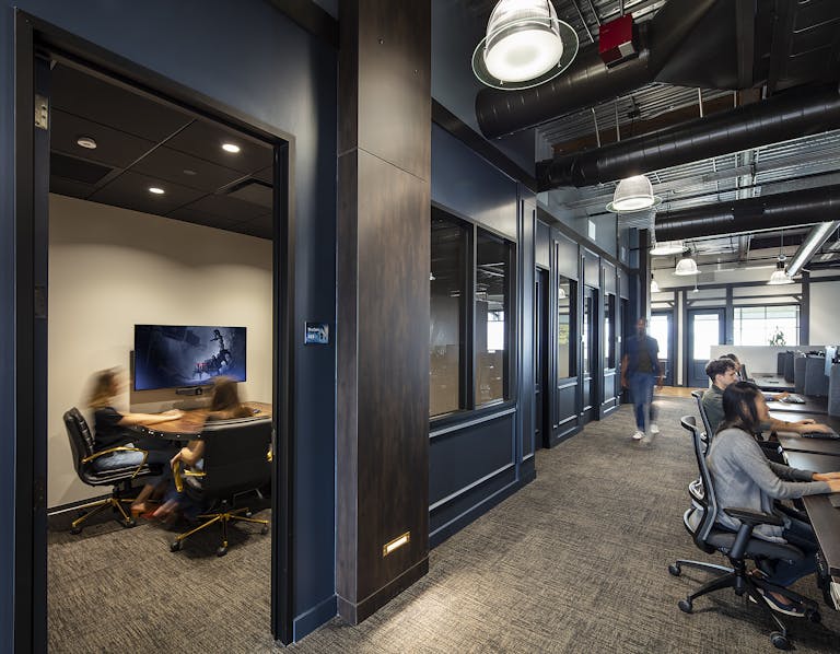 Specialty millwork was created to resemble metal beams and columns with strategically placed rivets, while concrete stained floors and factory style lighting provide a cohesive design throughout. Brick veneer and wall graphic applications also add to the brand experience. The installation of rolling garage doors and open balconies creates several indoor-outdoor areas, which work to further the employee teams flow of ideas and creative process.