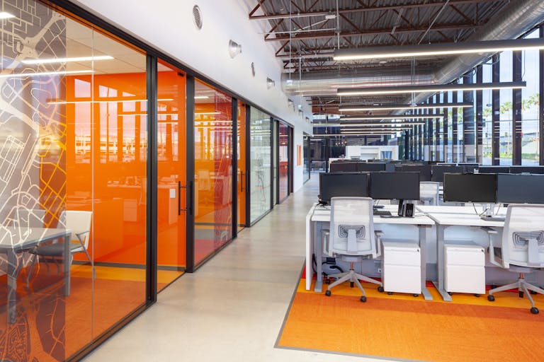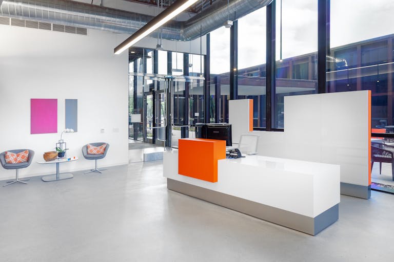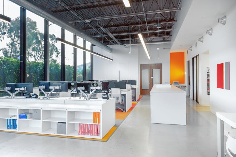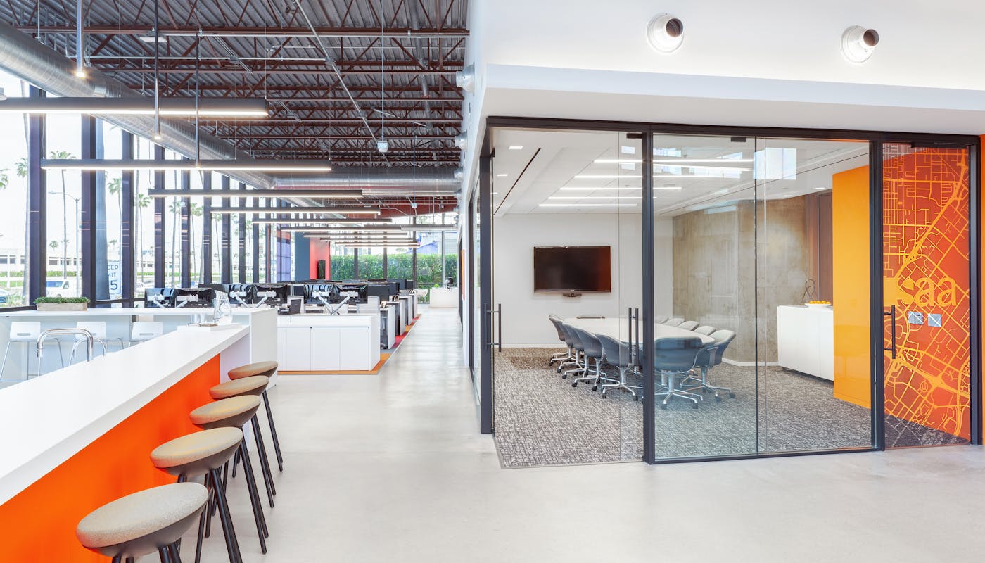 Exposed ceilings with full height windows create a light and bright environment, contributing to the collaborative nature of the firm. Custom Haworth sliding glass is used in place of walls to section off conference rooms. A 9-screen media wall was installed to showcase SAA’s branding and experience to visitors. Vibrant flooring colors and accent walls, along with polished concrete are used for the tenant throughout. The location is part of “The Launch” on MacArthur Blvd, a site newly redeveloped by the Irvine Company, and adjacent to Orange County's John Wayne Airport.