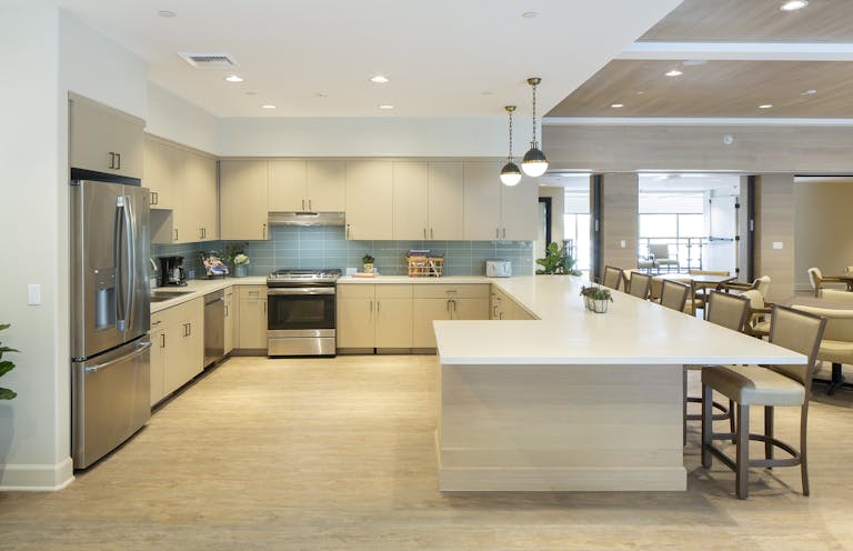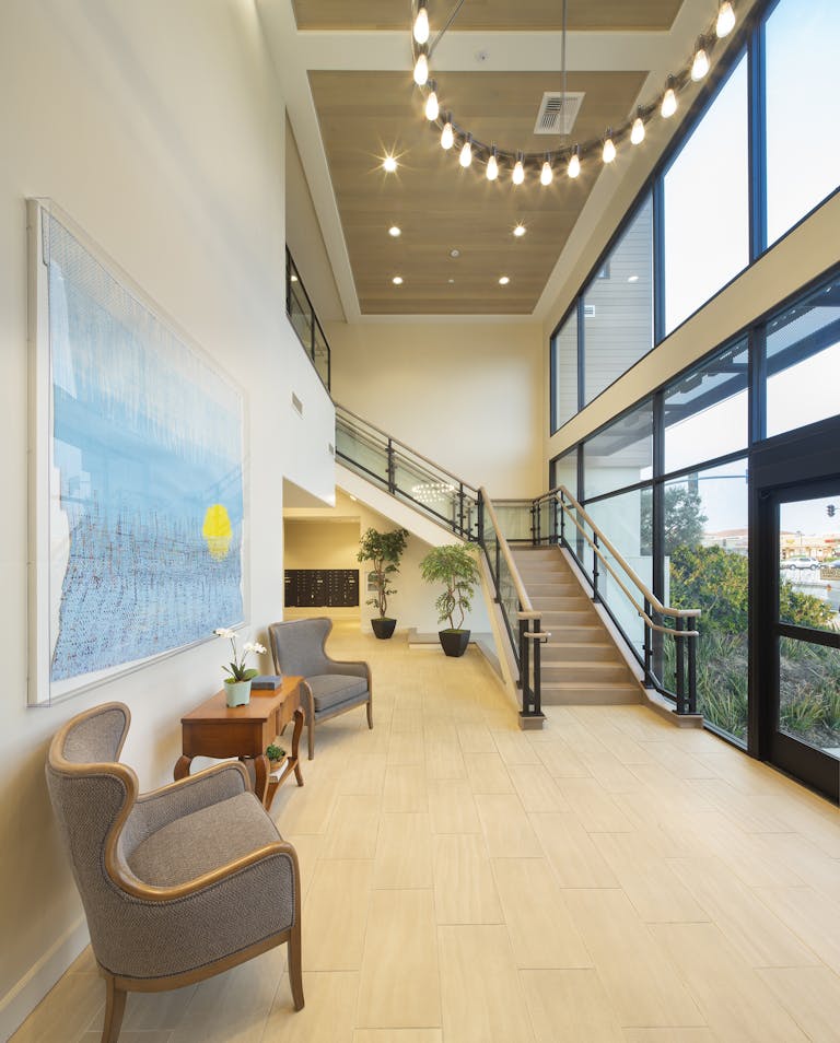 Building amenities include a community room with communal kitchen, fitness center and enclosed parking garage. The property is lined with landscaped pathways, along with a courtyard featuring outdoor barbeque dining area and playground. The mixed use project, including retail space on the ground floor, is Type-V construction over a one-story podium deck.