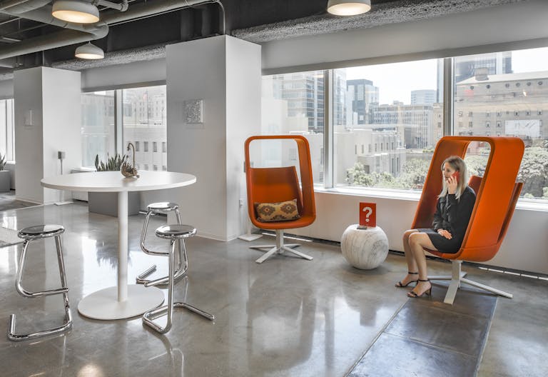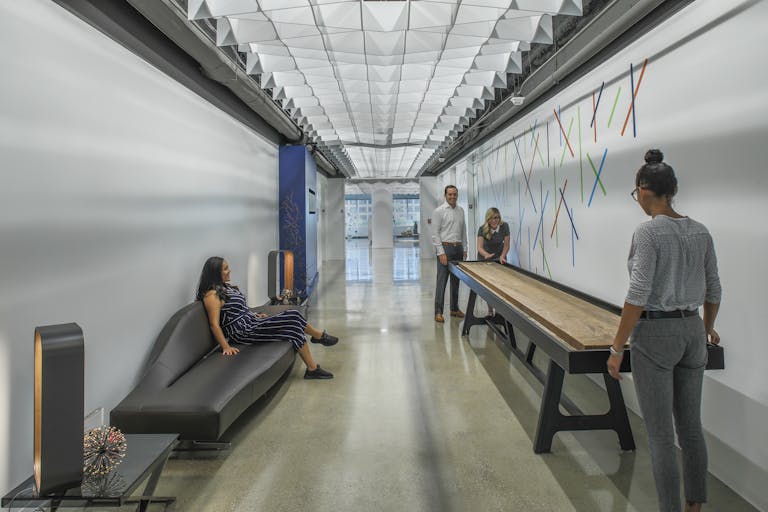 Exposed ceilings are punctuated with artful lighting installations and decorative noise-cancelling acoustical panels throughout. To help further mitigate noise disturbances, custom furniture designer Haworth was commissioned to create sound-proof pods placed in various locations. A Habitat Soundscape from Plantronics is connected in eleven zones. The system uses an algorithm through speakers and microphones to level out ambient noise while video screens provide soothing water sounds.