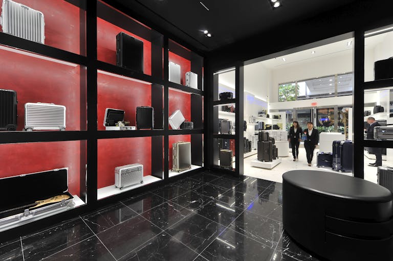 As one of Europe’s leading luggage manufacturers, the Rimowa showroom retail store at Ala Moana in Hawaii artfully displays the popular luxury pieces.